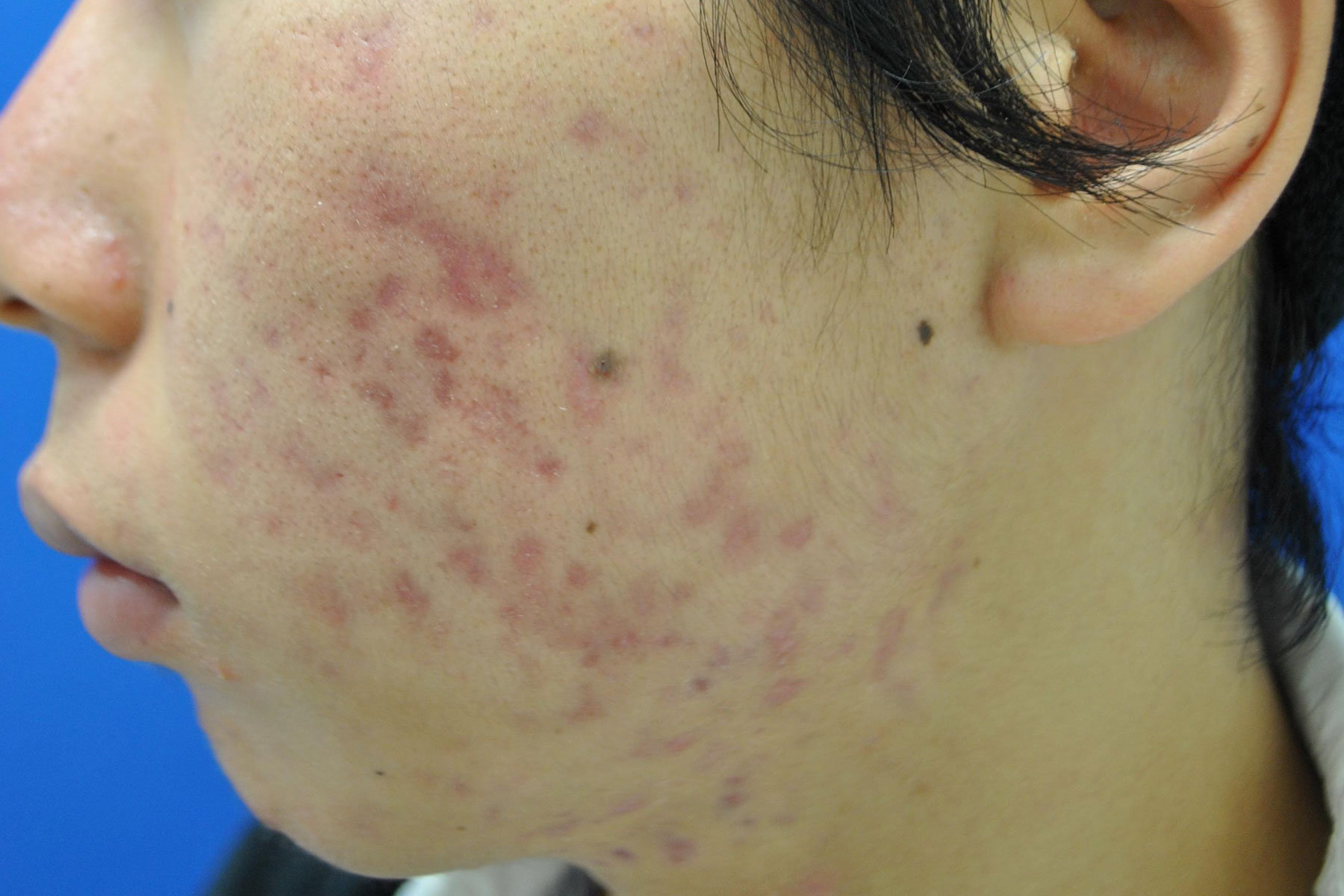 ニキビ跡の凹み・ニキビ跡の赤み・色素沈着が目立つ症例です。生活習慣の指導を行いながら、治療を続けました。完全にフラットに戻す事は難しいですが、凹み部分もかなり改善が見られ、治療効果にもご満足頂いております。