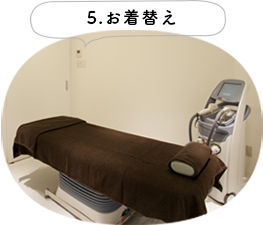 施術室でタオルガウンにお着替えいだたきます。照射部位と着ている服によっては、着替えず照射をすることも可能です。(ノースリーブでワキ脱毛など)