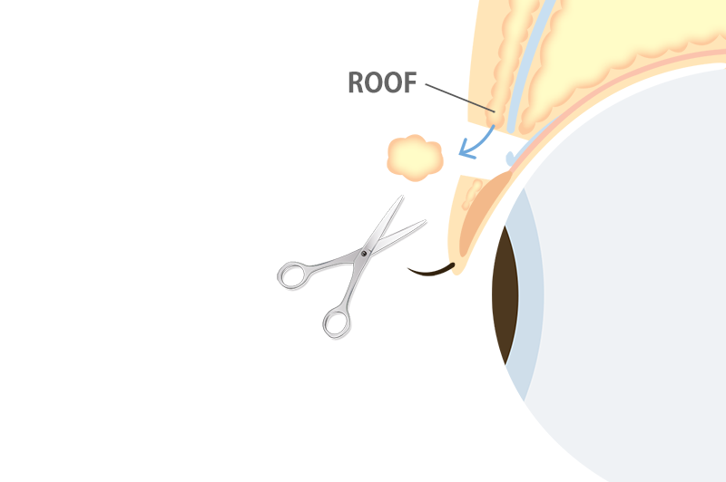 まぶたには眼瞼を補強する瞼板(けんばん)と、まぶたを引き上げる眼瞼挙筋(がんけんきょきん)があり、この2つを挙筋腱膜(きょきんけんまく)という組織が繋いでいます。