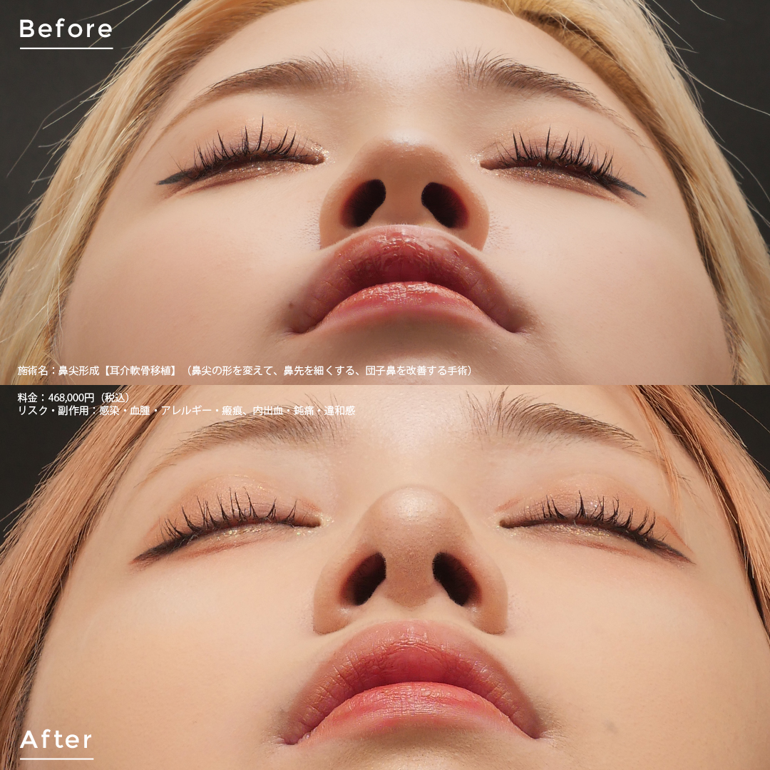 鼻尖形成はメスを用いて不要な組織を除去します。除去した組織が再生することはありません。耳介軟骨移植を行う場合も、移植した軟骨が吸収され消えてなくなることはありません。一度手術をすれば、効果は半永久的です。