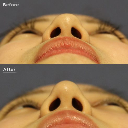鼻先の軟骨部分が歪んでいる場合は、鼻の穴の中と鼻柱(びちゅう:鼻の穴と穴の間の壁)を切開して鼻中隔軟骨(びちゅうかくなんこつ)の彎曲部分を切除するなど、必要な処置を行います。鼻の穴の中のみを切開する場合、傷跡は外から見えませんが、鼻中隔を切開する場合、鼻柱に傷跡が残ります。